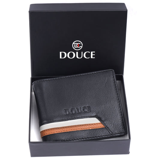 DOUCE Stripe Accent RFID Leather Wallet – Black & Tan Elegance
